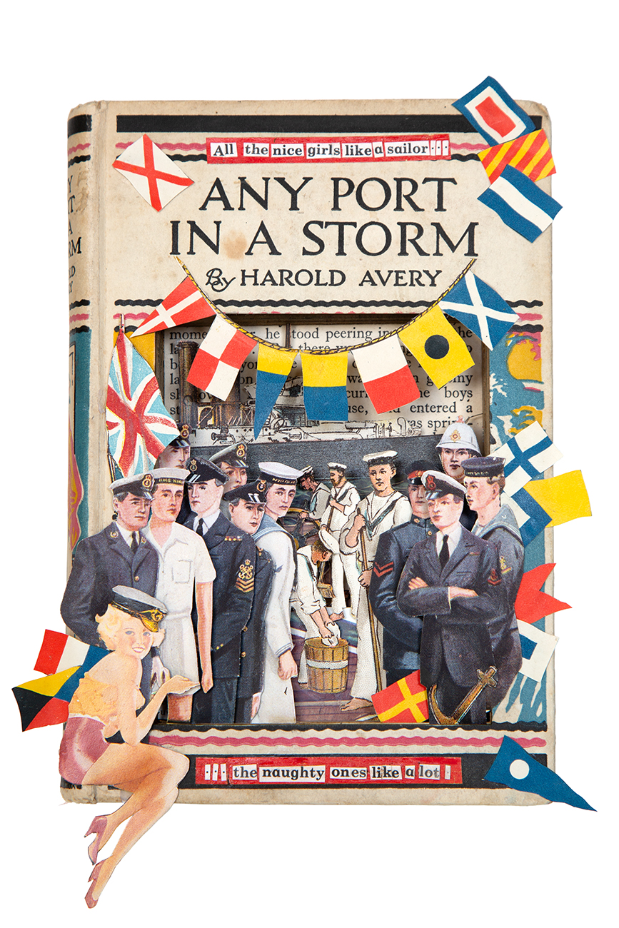 Signed giclée prints of collaged book works with witty takes on social media.