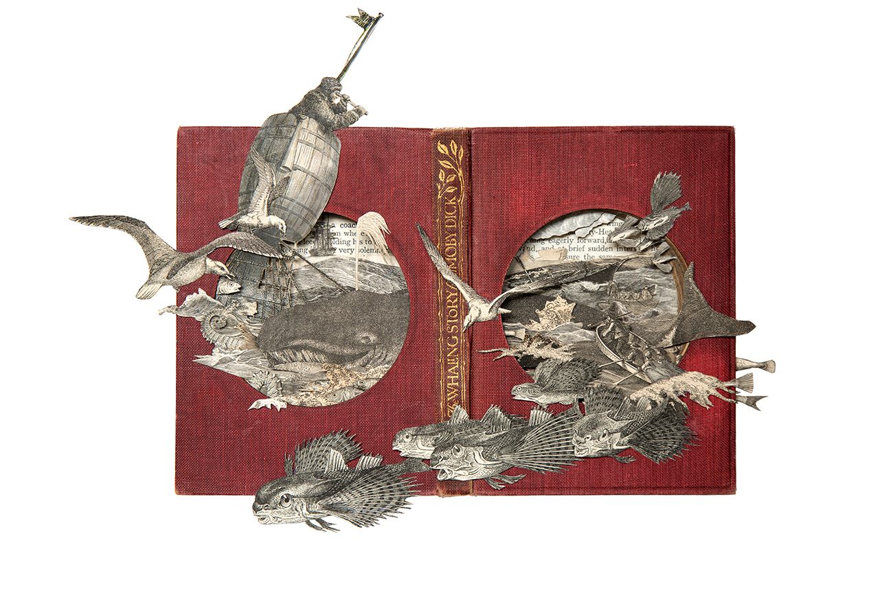 Signed giclée prints of collaged book works inspired by original titles, creating layered artworks.
