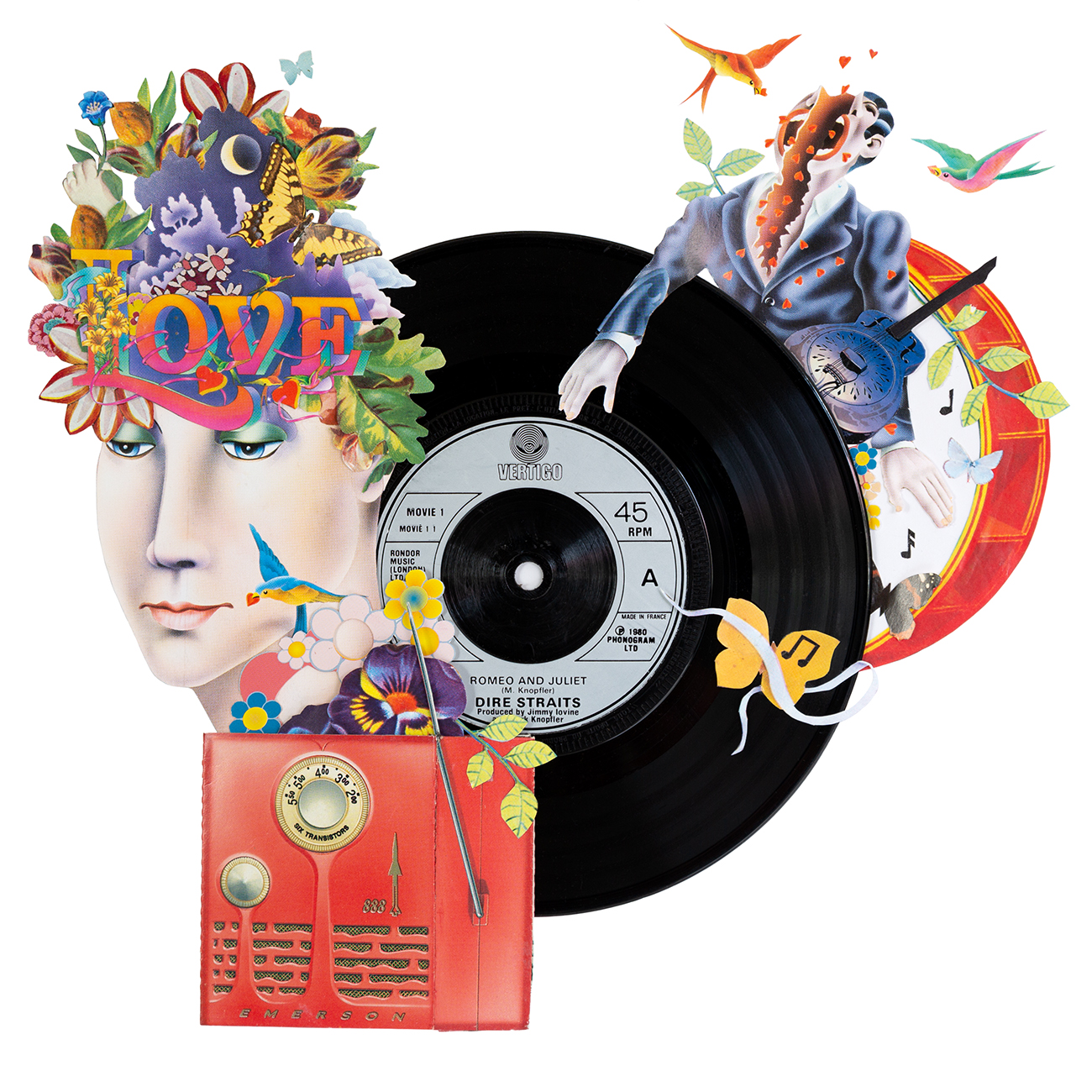 Signed giclée prints of original vinyls with collaged, playful, paper embellishments.