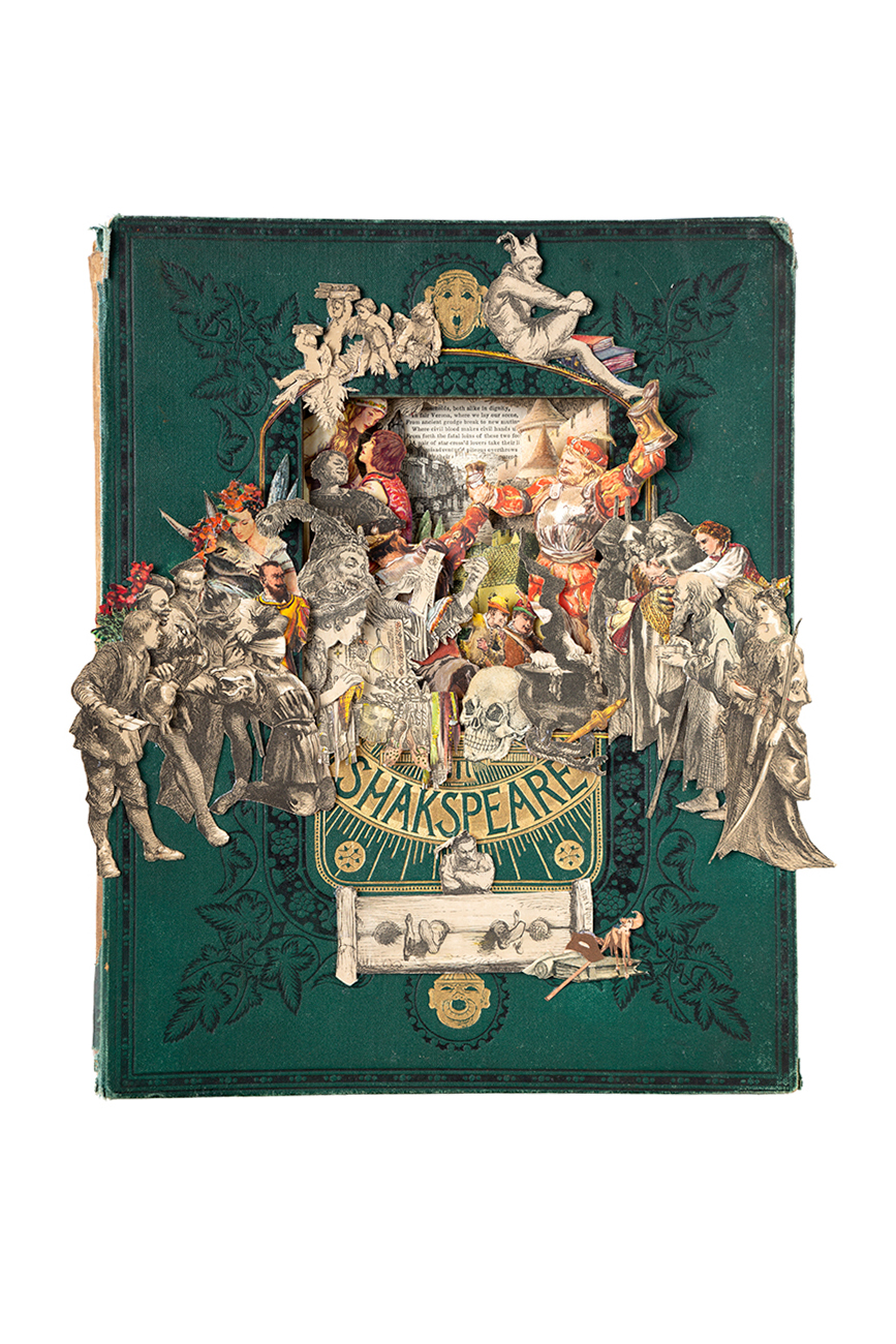 Signed giclée prints of collaged book works inspired by original titles, creating layered artworks.