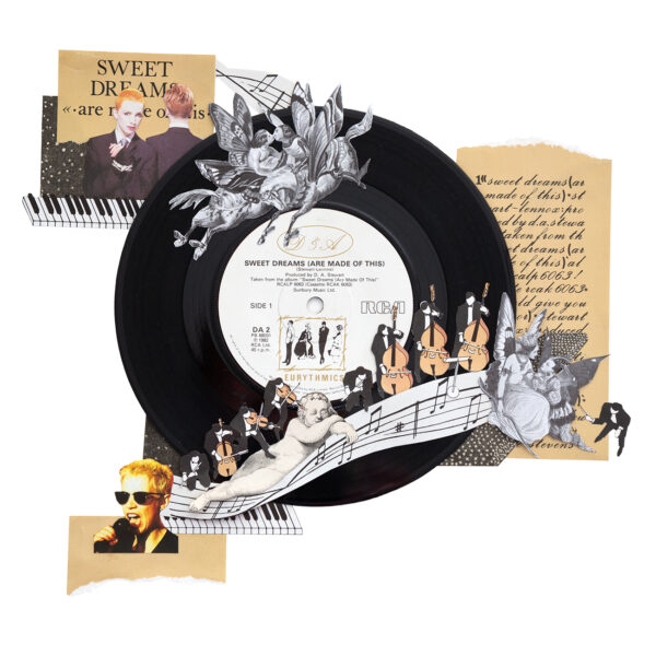 Signed giclée prints of original vinyls with collaged, playful, paper embellishments.