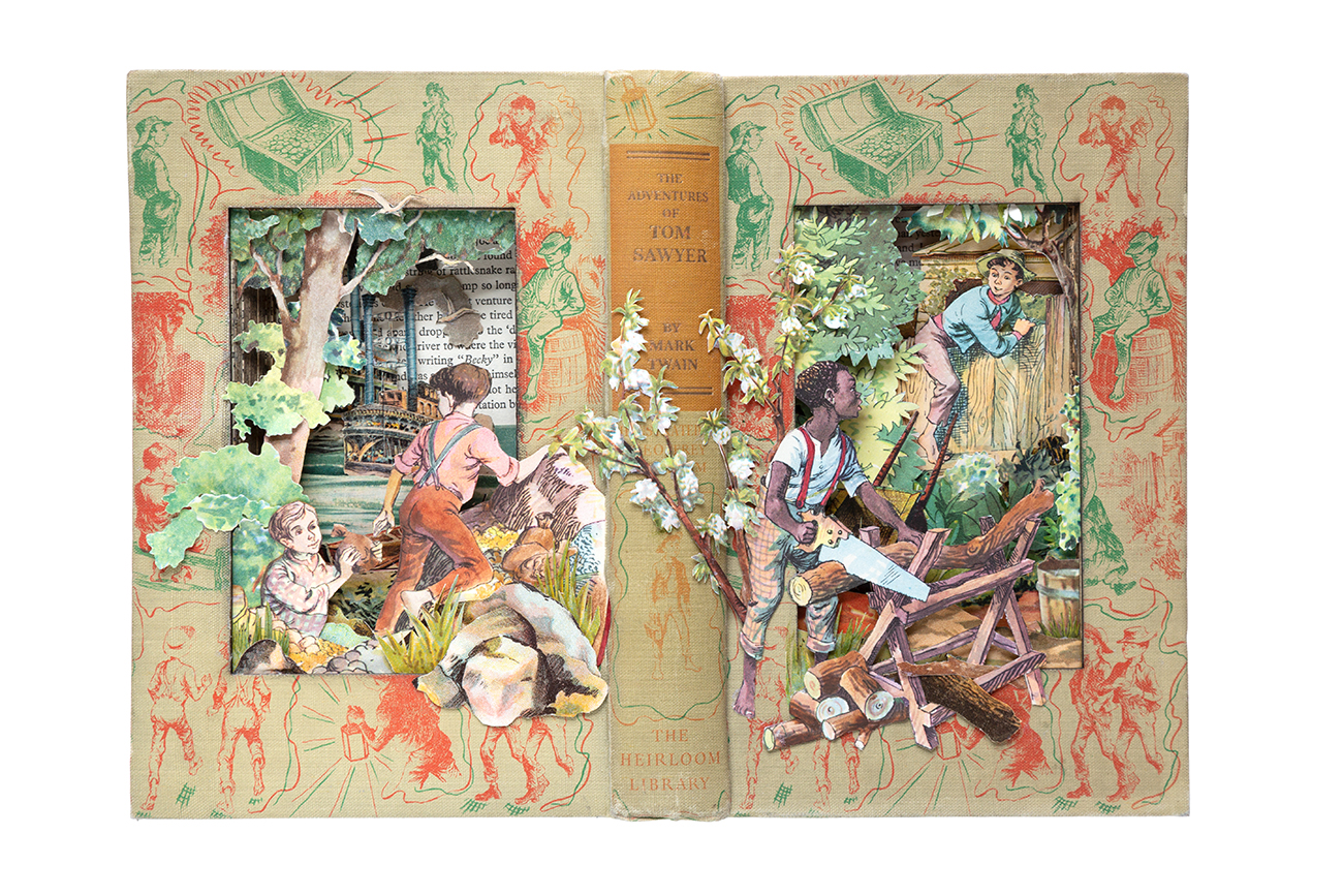 Signed giclée prints of collaged book works inspired by original titles, creating layered artworks.