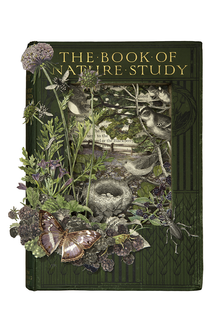 Signed giclée prints of collaged book works inspired by original titles, creating layered artworks.
