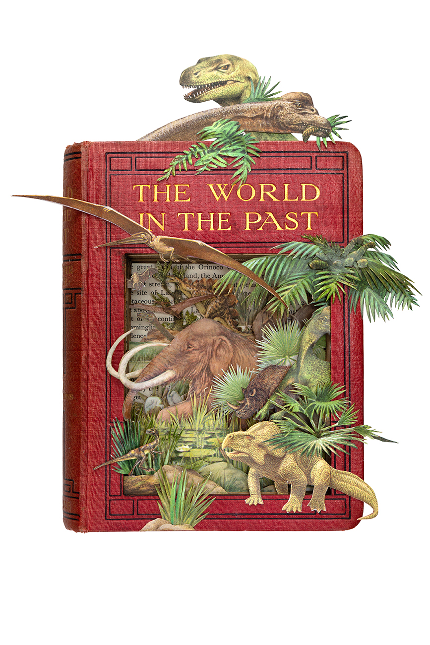 Signed giclée prints of collaged book works inspired by original titles, creating layered artworks.