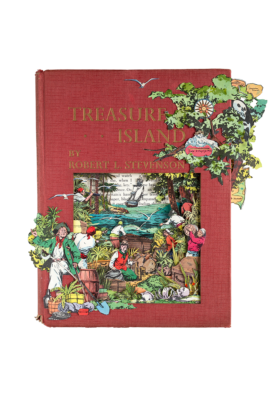 Signed giclée prints of collaged book works inspired by original titles, creating layered artworks.